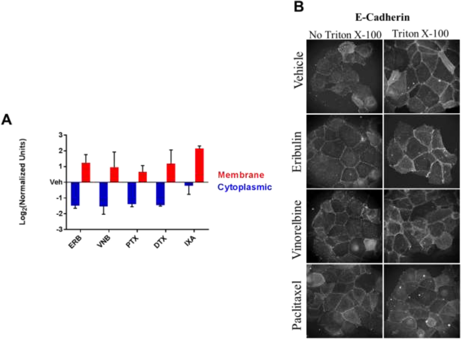Figure 5: The effect of MTAs on the subcellular distribution of E-cadherin. A. Membrane and cytoplasmic-enriched lysates of HCC1937 cells treated for 2 hours with vehicle or MTAs were prepared and analyzed by immunoblotting. Quantification of E-cadherin in the cytoplasmic and membrane-enriched fractions as compared to vehicle. N = 3 ± SEM. B. HCC1937 cells were prepared for indirect immunofluorescence with or without Triton X-100 permeabilization following 4% paraformaldehyde fixation. Arrows indicate E-cadherin ridges between cells in the absence of Triton X-100. Images are composed of non-deconvolved stacks.