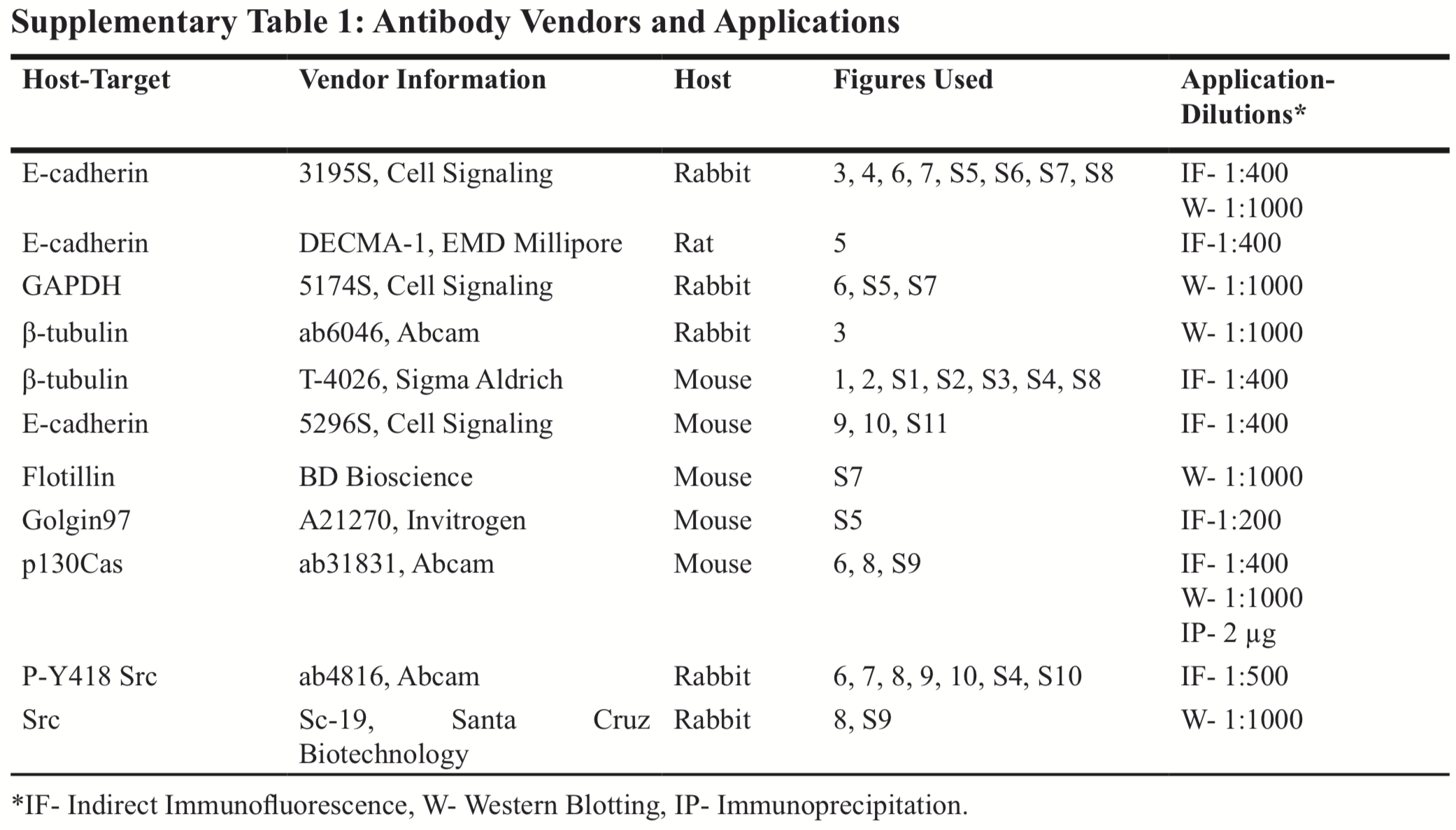 This article has been corrected: The authors recently became aware that the antibody used for Figure 5B was inappropriate to address the ability of E-cadherin to be accessible from the extracellular space in the absence of Triton X permeabilization. The E-cadherin antibody, DECMA-1 from EMD Millipore (Cat. # MABT26) which has the ability to block E-cadherin- associated cell adhesion, is appropriate to address this question. Multiple experiments were conducted with the DECMA-1 antibody in the presence and absence of Triton X permeabilization. New pictures were taken, and a revised Figure 5B using these new images is shown below. A revised Supplementary Table 1 with a list of the antibodies used for each figure is also shown. The authors declare that these corrections do not change the results or conclusions of this paper.