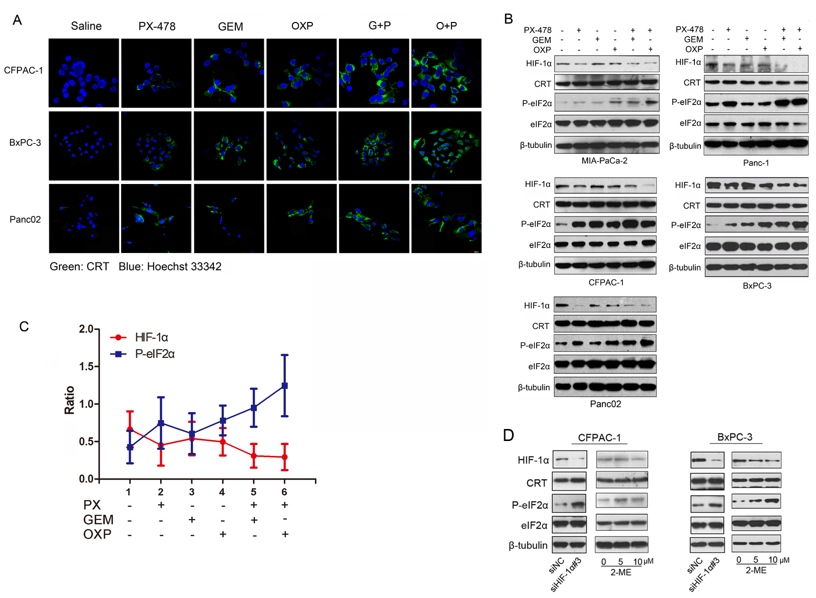 Figure 4: Negative correlation between HIF-1α expression and eIF2α phosphorylation. PDAC cell lines were incubated with saline, Gem (1.0 μM), PX-478 (25 μM), Gem/PX-478, OXP (oxaliplatin) (300μM) or OXP/PX-478 for 24 hours. (A) CRT surface exposure on CFPAC-1, BxPC-3 and Panc02 cell lines. Non-permeabilized cells were co-stained with anti-CRT antibody and Hoechst 33342 and determined by confocal microscopy (magnification, 600×). Green colour indicates ecto-CRT. (B) Five PDAC cell lines were treated with GEM, PX-478, OXP (300μM), Gem/PX-478, or Gem/OXP for 24 hours. Expression of HIF-1α, CRT, P-eIF2α, and eIF2α was determined by Western blotting. β-tubulin was used as a loading control and OXP was served as a positive control. (C) Negative correlation between levels of HIF-1α and P-eIF2α. Expression levels of both HIF-1α and P-eIF2α were analysed by densitometry and represented as ratios of HIF-1α/β-tubulin and P-eIF2α/β-tubulin. Data were collected from 5 cell lines and expressed as mean ± SD. Correlation between HIF-1α and P-eIF2α was analysed by Pearson’s correlation method. **P<0.01, γ=-0.943. (D) Pancreatic cancer cell lines (CFPAC-1 and BxPC-3) were treated with siHIF-1 and 2-ME and then evaluate the expression HIF-1α, CRT and P-eIF2α by Western blotting experiment.