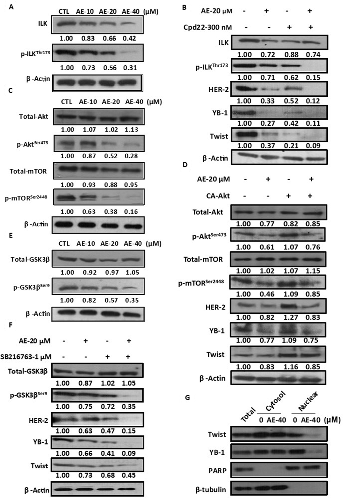 Figure 6: Aloe-emodin inhibited ILK signaling pathways in HER-2-overexpressing breast cancer cells. (A) SkBr3 cells were treated with various concentrations of AE for 48 h. Cell lysates were immunoblotted with anti-ILK and anti-phospho-ILKThr173 antibody. (B) SkBr3 cells were treated with 20 μM AE or 300 nM ILK inhibitor cpd-22 for 48 h. Cell lysates were immunoblotted with anti-ILK, anti- phospho-ILKThr173, anti-HER-2, anti-YB-1, and anti-Twist antibodies. (C) SkBr3 cells were treated with various concentrations of AE for 48 h. Cell lysates were immunoblotted with anti-phospho-AktSer473 and anti-phospho-mTORSer2448 antibodies. (D) SkBr3 cells were transfected with constitutively active Akt and treated with 20 μM AE for 48 h. Cell lysates were immunoblotted with anti-phospho- AktSer473, anti-phospho-mTORSer2448, anti-HER-2, anti-YB-1, and anti-Twist antibodies. β-Actin was used as the loading control. (E) SkBr3 cells were then harvested and lysed for the detection of phospho-GSK3βSer9 and β-Actin. (F) SkBr3 cells were treated with 20 μM AE or 1 μM phospho-GSK3βSer9 inhibitor SB216763 for 48 h. Cell lysates were immunoblotted with anti-phospho-GSK3βSer9, anti- HER-2, anti-YB-1, and anti-Twist antibodies. (G) SkBr3 cells were treated with 40 μM AE for 24 h. Following cell fractionation, Twist and YB-1 content in the cytoplasmic or nuclear fraction was determined through Western blotting. PARP was used as the nuclear marker. β-Tubulin was used as the cytoplasmic marker.
