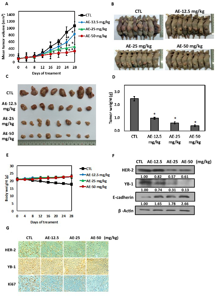 Figure 7: Effects of aloe-emodin on anti-tumor activity. (A) SkBr3 cells were used to establish xenografts in male BALB/c nude mice. Animals (six mice/group) were given control and AE (12.5, 25, and 50 mg/kg) by i.p. injection 5 times for 14–18 days. Tumor size was monitored through serial caliper measurements twice a week. Each point represents mean tumor size ± SE. (B) One representative mouse and its tumors are shown. (C) Representative tumors in each group are demonstrated. (D) Tumor weight was calculated as indicated in Materials and methods section. (E) Weekly body weight measurements indicated that therapy was not toxic. Each point represents mean ± SE. (F) Tumor tissues were immunoblotted with anti-HER-2, anti-YB-1, and anti-E-cadherin antibodies. (G) Tumor tissue was collected at the conclusion of therapy, fixed in 10% normal buffered formalin, and embedded in paraffin. Four-micron (4 μM) sections of tumor tissue were assessed using immunohistochemistry for androgen receptor expression. Immunohistochemical analyses in xenograft tumors on day 28 after AE treatment were performed using antibodies against HER-2, YB-1, and Ki67. Magnification, ×40; scale bar, 500 μM.