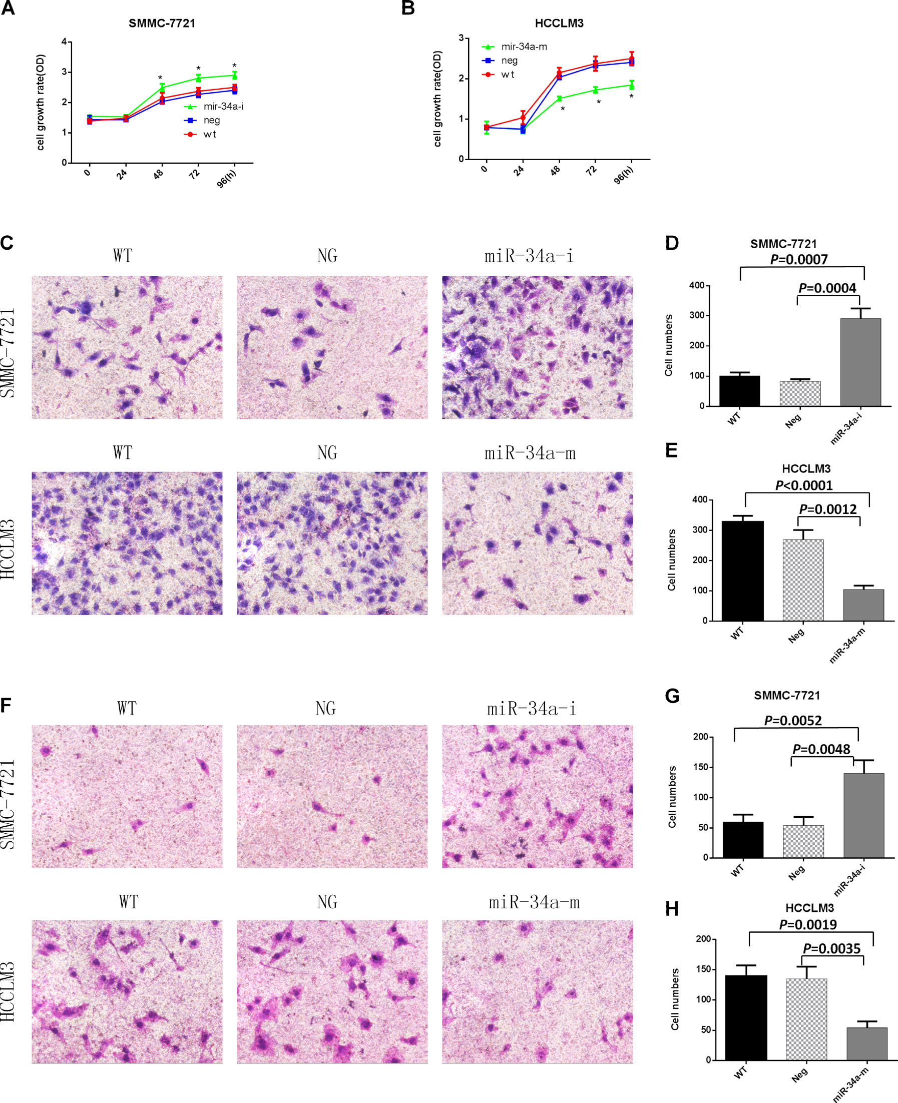 Figure 2: Proliferation, migration, and invasion assays of SMMC-7721 and HCCLM3 cells after transfection with the indicated oligonucleotides. WT, NG, miR-34a-m, and miR-34a-i indicate non-transfected, negative control oligonucleotide-transfected, miR-34a mimic- transfected, and miR-34a inhibitor-transfected cells, respectively. (A) SMMC-7721 cell growth rates after transfection with the miR-34a inhibitor. (B) HCCLM3 cell growth rates after transfection with the miR-34a mimic. * = P<0.05, compared to negative controls at the same time point. (C) Representative images of the migration assay. (D) and (E) Numbers of migrating cells on the undersides of the membranes. Data are presented as mean ± SEM and are representative of three independent experiments. The images were acquired at a magnification of 200×. (F) Representative images of the invasion assay. (G) and (H) Numbers of invading cells on the undersides of the membranes. Data are presented as mean ± SEM and are representative of three independent experiments. The images were acquired at a magnification of 200×.