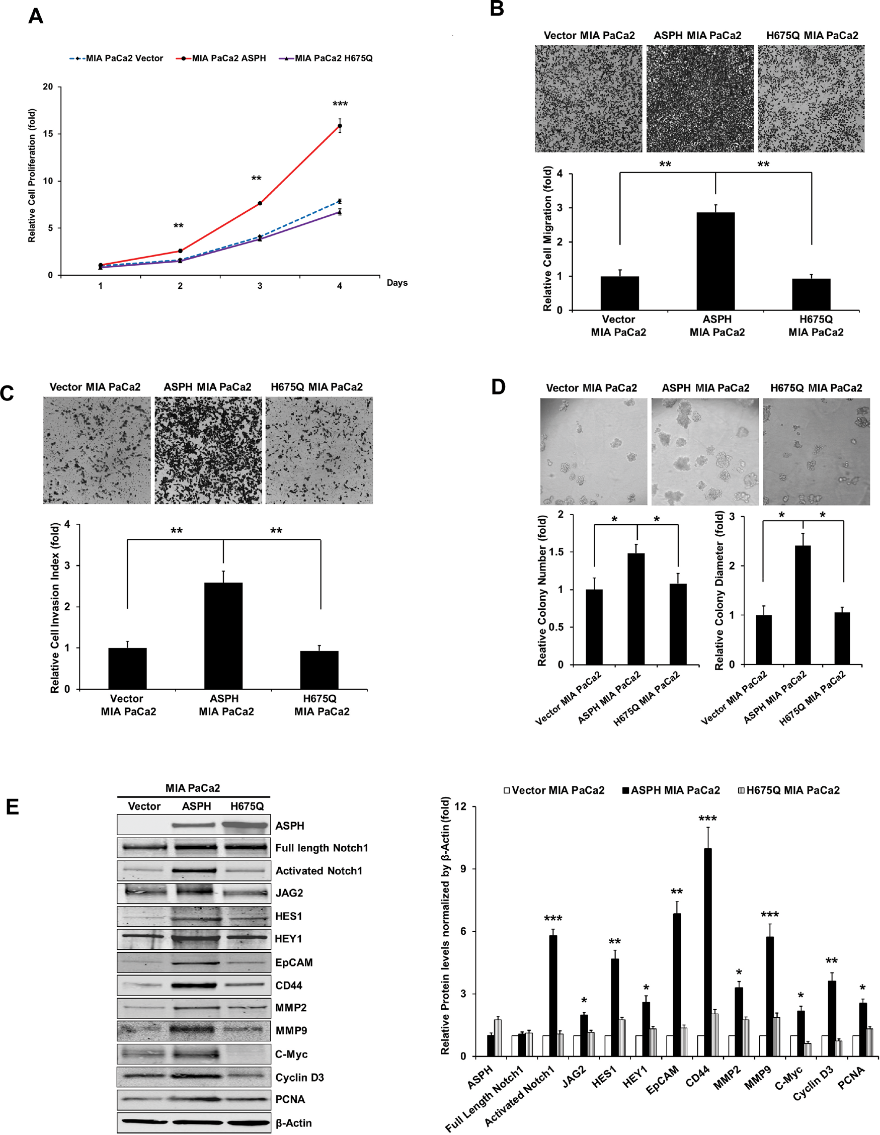 Figure 5: The β-hydroxylase activity of ASPH is required for its transforming activity. MIA PaCa2 cells were stably transfected with empty vector (EV), “wild type” (WT)-ASPH, or H675Q-ASPH mutant and the levels of expression were confirmed by Western blot. There is low-level endogenous ASPH in MIA PaCa2 cells as shown here and in Fig. 1. Effects of EV, WT-ASPH and H675Q-ASPH on (A) cell proliferation, (B) migration, (C) invasion, and (D) colony formation are significantly different. (E and F) represents a Western blot demonstrating WT-ASPH induced activation of Notch signaling as determined by increased levels of Notch1 ICN, JAG2, as well as increased expression of downstream responsive genes HES1, HEY1, EpCAM, CD44, c-Myc, MMP2/9, cyclin D3 and PCNA. In contrast, the mutant H675Q ASPH construct shows significantly reduced activated Notch1 ICN, JAG2, as well as HES1, HEY1, EpCAM, CD44, c-Myc, MMP2/9, cyclin D3 and PCNA. The results suggest that the β-hydroxylase activity of ASPH is essential for Notch signaling activation. *p<0.05; **p<0.01; ***p<0.001.