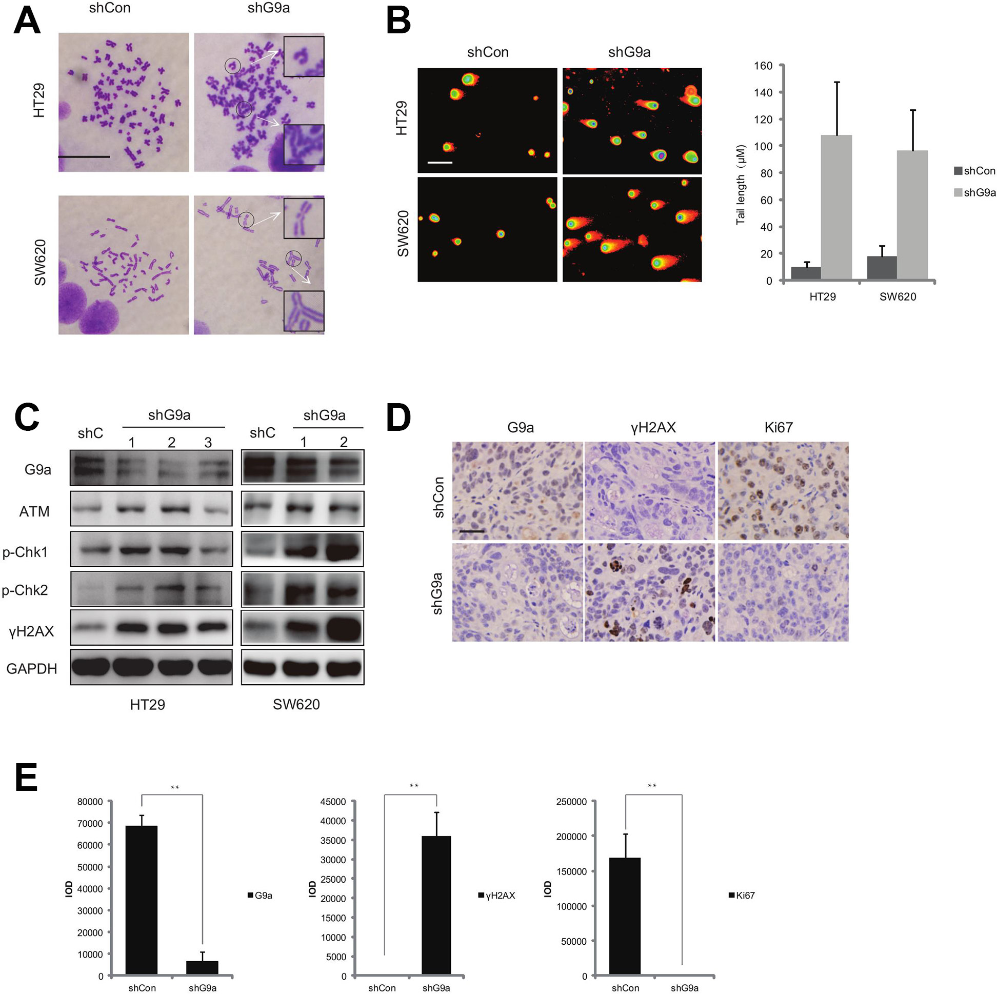 Figure 4: Down-regulation of G9a induces DNA damage in colon cancer. (A) Karyotype analysis showed that down-regulation of G9a induced chromosome instability (scale bar 10 μM). (B) DNA damage as assessed by the comet assay (scale bar 25 μM). (C) The protein expression levels for G9a, ATM, p-Chk1 (Ser 317), p-Chk2 (Thr 68), γH2AX, and GAPDH (loading control) following the stable knockdown of G9a in HT29 and SW620 cells. (D) Representative immunohistochemical staining images of G9a, Ki67, and γH2AX in xenografts derived from HT29 cells that stably silenced G9a expression (scale bar 25 μM). (E) The quantified results by Image Pro Plus based on the immunohistochemical staining in Figure 4D. **P < 0.01.