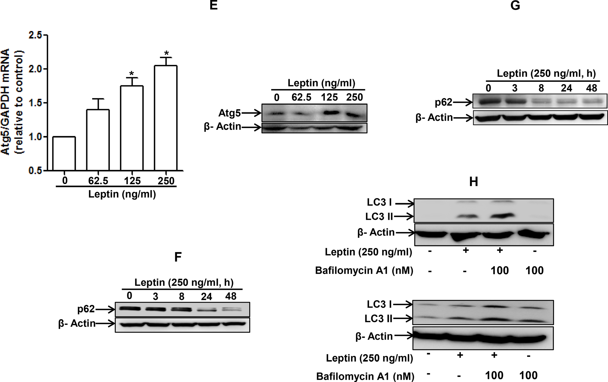 Figure 2: Effects of leptin on the expression of autophagy-related proteins. (A) and (B) Effect of leptin on LC3B mRNA and LC3 II protein expression. HepG2 cells (A) and MCF-7 (B) cells were incubated with indicated leptin concentration for 48 h or leptin (250 ng/ml) for different time periods. LC3B mRNA expression level was determined by qRT-PCR as described previously (left panel). LC3 II protein expression level was determined by Western blot analysis as described previously. Representative images from three independent experiments that showed similar results are shown along with β-actin as an internal loading control. (C) and (D) Effect of leptin on beclin-1 mRNA and protein expression. HepG2 cells (C) and MCF-7 Cells (D) were incubated with the indicated concentration of leptin for 48 h.Beclin-1 mRNA expression level was determined by qRT-PCR (left panel) and beclin-1 protein expression level (right panel) was determined by Western blot analysis as described previously. (E) Effect of leptin on Atg5 expression. HepG2 cells were incubated with indicated leptin concentration for 48 h.Atg5 mRNA (left panel) and protein expression (right panel) was determined as described previously. (F) and (G) Effect of leptin on p62 expression. HepG2 cells (F) and MCF-7 cells (G) were treated with leptin (250 ng/ml) for the indicated time points. p62 protein expression level was determined by Western blot analysis as described previously. (H) HepG2 (left panel) and MCF-7(right panel) cells were pretreated with Bafilomycin A1 for 2 h, followed by leptin treatment for 48 h.LC3 II proteins were determined by Western blot analysis. Representative image from three independent experiments is shown. (I) and (J) Effect of leptin on autophagosome formation. HepG2 cells (I) and MCF-7 cells (J) were transfected with eGFP-LC3 expression plasmid for 36 h, followed by treatment with leptin (250ng/ml) for the indicated time points. Autophagosome formation (LC3 dots) was measured by capturing the images using A1 Confocal Laser Microscope. Representative images from three independent experiments are shown along with quantitation of LC3 dots on the lower panel. Values are expressed as percentage cells with GFP-LC3. *P<0.05 compared with cells not treated with leptin.