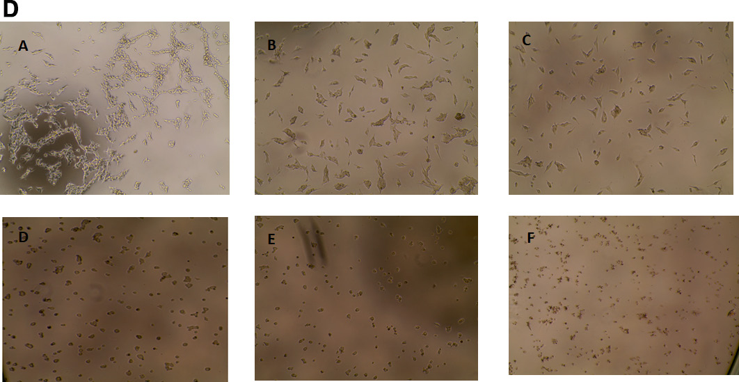 Figure 1: Cytotoxicity of FEO on B16-F10, FM94 and HNEM cells. (D) FM94 cells treated with FEO (A-Untreated cells; B-3 μg/ ml; C-5 μg/ml; D-7 μg/ml; E-10 μg/ml; F- Dox 5 ug/ml) for 24 h and morphological image was photographed by EVOS image analyser; E: HNEM cells treated with FEO (A-Untreated cells; B-3 μg/ml; C-5 μg/ml; D-7 μg/ml; E-10 μg/ml; F- Dox 5 ug/ml) for 24 h and morphological image was photographed by EVOS image analyser. Data presented as mean ± SD of triplicates of three independent experiments. *Represents significant difference at p < 0.05 compared with control. **Represents significant difference at p < 0.01 compared with control. ***Represents significant difference at p < 0.001 compared with control. NS: Non significant. Scale bar indicates 10 um.
