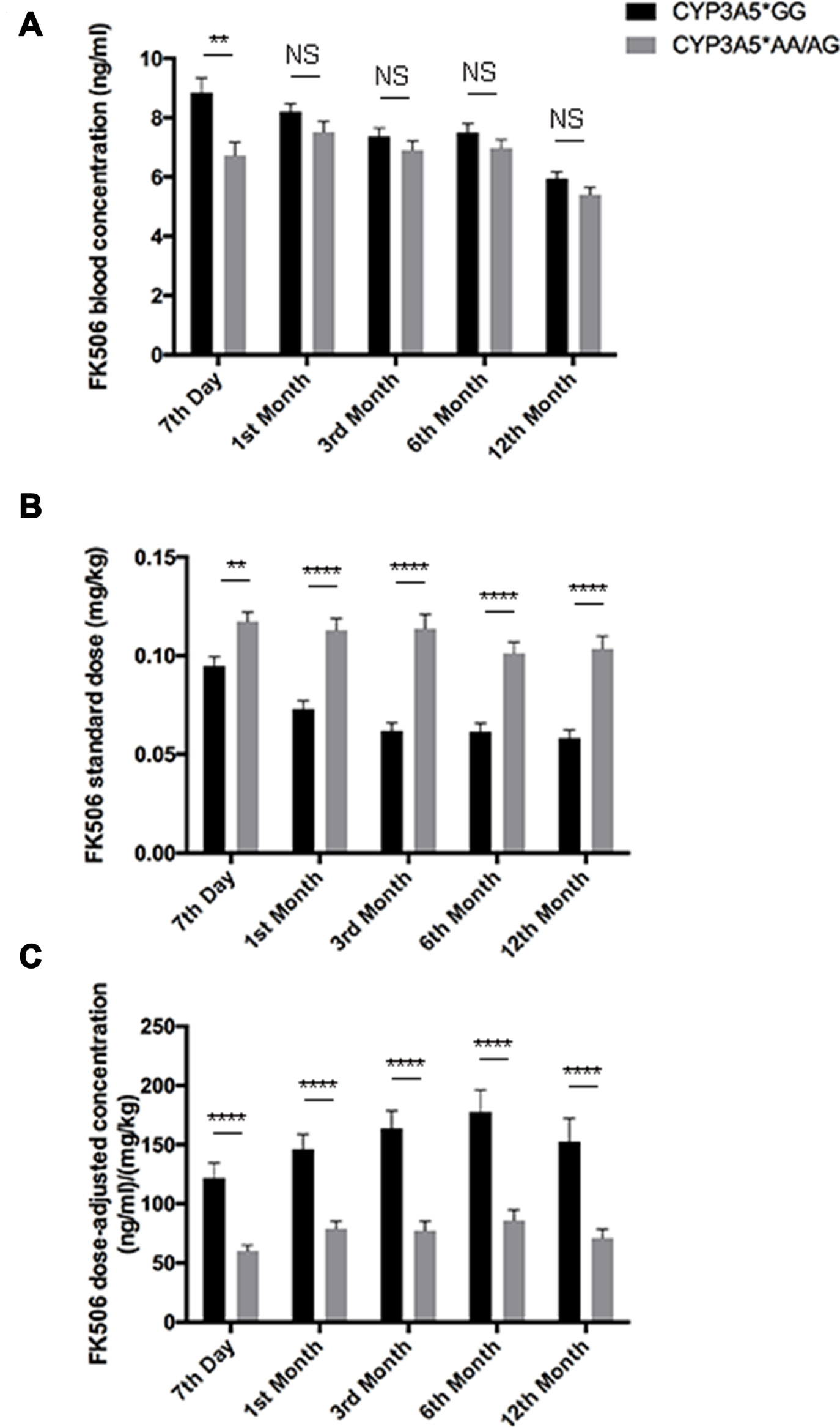 Figure 1: FK506 dose adjusted concentration related to CYP3A5 genotype. FK506 blood concentrations A., FK506 standardized dose B., and dose normalized FK506 concentration C., of CYP3A5* GG recipients and CYP3A5* AA/AG recipients at 7th day, 1st month, 3rd month, 6th month and 12th month after the kidney transplantation. NS: not significant, **: p < 0.01, ****: p < 0.0001. Error bars in graphs indicates SEM.