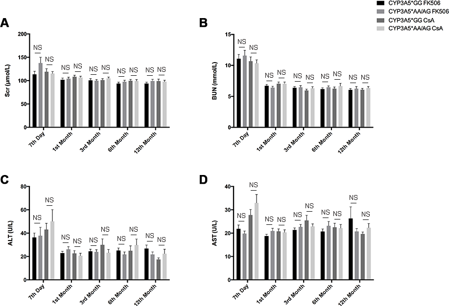 Figure 3: Clinical parameters of liver and kidney injury related to CYP3A5 genotype and different immunosuppressors. Clinical parameters of kidney function, Scr A., BUN B. and liver injury, ALT C., AST D., for each recipient was measured in 7 day, 1st month, 3rd month, 6th month and 12th month after the kidney transplantation. NS: not significant. Error bars in graphs indicates SEM.