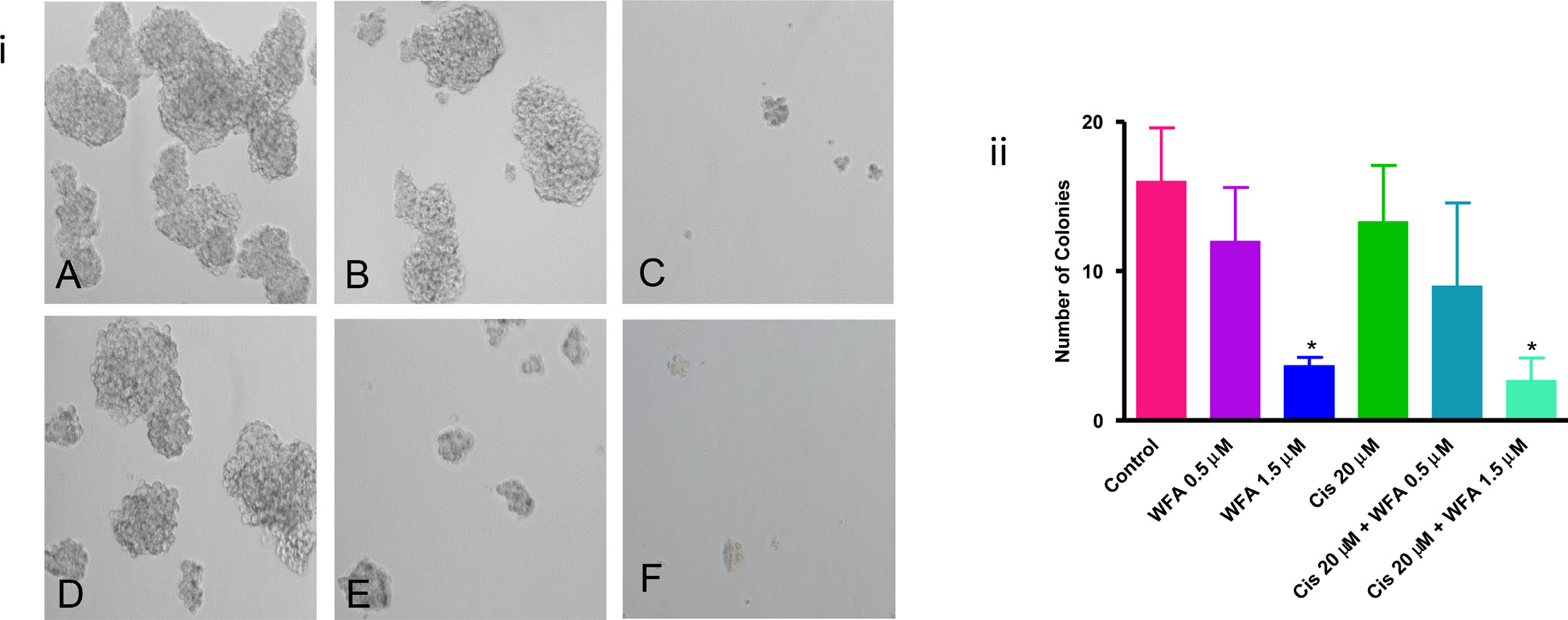 Figure 3: Effect of WFA and CIS both alone and in combination on spheroid formation. (A) - Control, (B) - WFA (0.5 μM), (C) - WFA (1.5 μM), (D) - CIS (20 μM), (E) - WFA (0.5 μM) + CIS (20 μM), and (F) - WFA (1.5 μM) + CIS (20 μM). i) Photomicrographs of spheroids under various treatment groups as described above. ii) Quantitative analysis of spheroids. Spheroids > 50 mm were counted. The number shown is average of spheroids counted in 6 different low power fields at 200X. Data shown is representative of three independent experiments. * represents p < 0.05.