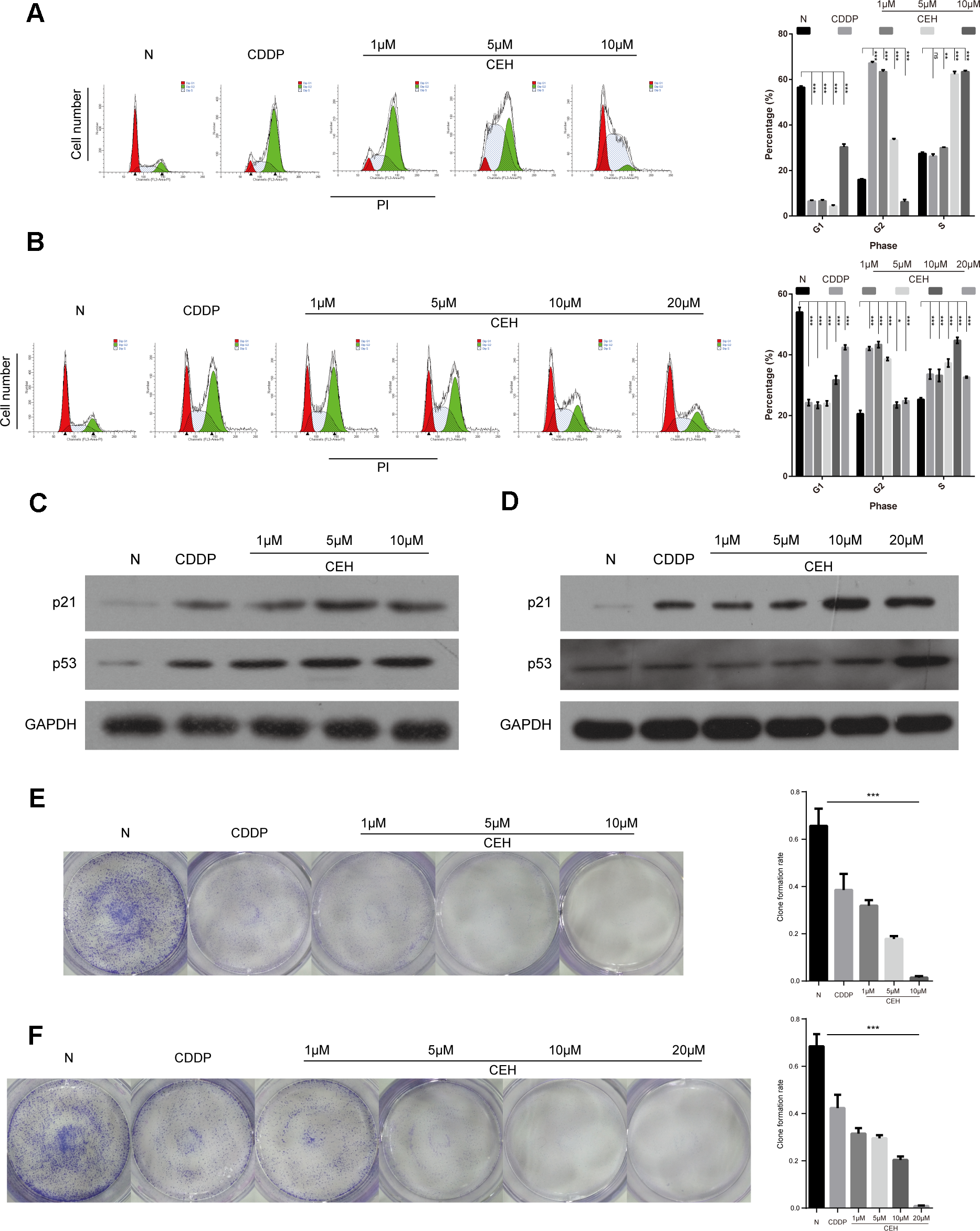 Figure 2: Induction of cell cycle arrest and inhibition of cell proliferation by cisplatin (cDDP) alone and combined with cepharanthine hydrochloride (CEH) in esophageal cancer cell lines. (A and B) Cell cycle analysis. Percentages of Eca109 and Eca109/CDDP cells in the G1, S, and G2/M phases are presented respectively. Effects of cDDP and combined with various concentrations of CEH medication on cell cycle distribution. Eca109 (A) and Eca109/CDDP (B) cells were treated with 0, 1, 5, 10 and 20 μM CEH combined with cDDP for 48 h, and cell cycle distribution was measured by flow cytometry after PI staining. (C and D) p21 and p53 protein levels were determined by western blot analyses. GAPDH was used as the loading control. (E and F) Cells were treated with 0, 1, 5, 10 and 20 μM CEH combined with cDDP for 48 h; representative images of Eca109 (E) and Eca109/CDDP (F) clone formation are shown. ***, P < 0.001 compared with the control.