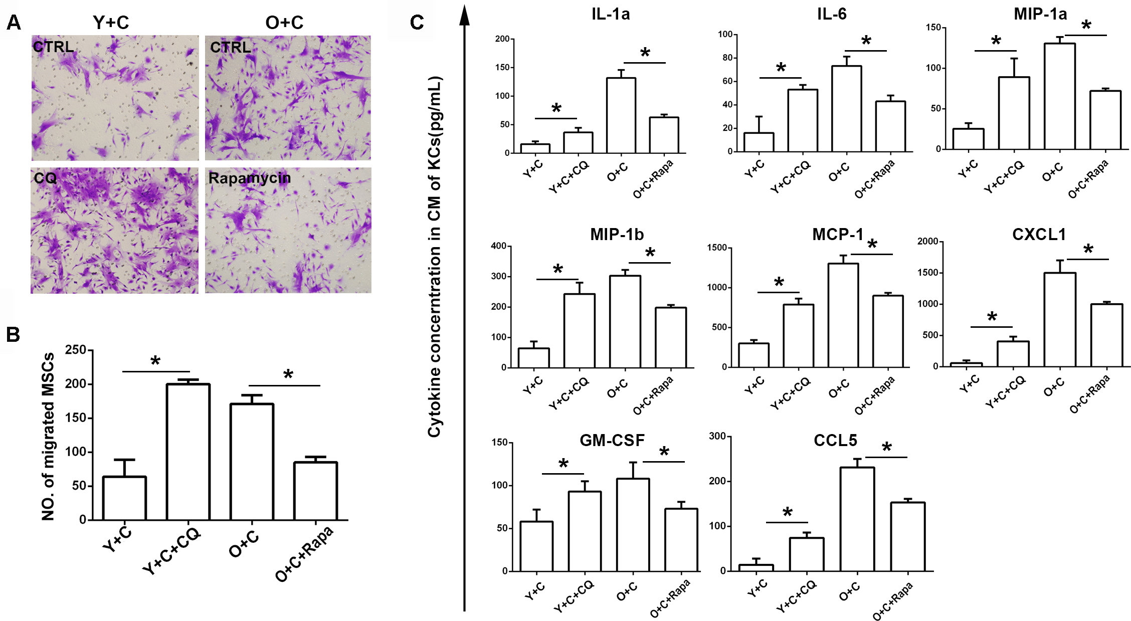Figure 6: Autophagy interference reversed recruitment of MSCs to KCs.(A) Transwell migration assay was performed to detect MSCs migration to KCs after autophagy interference. Migrated MSCs were stained by crystal violet(200×). KCs from Y+C mice were treated with 5μM CQ; KCs from O+C mice were treated with 100nm rapamycin. (B) The quantification of migrated MSCs of A. (C) Cytokines concentration in conditioned medium of KCs after autophagy interference was detected by bioplex assay. Y+C, young+CCl4; Y+C+CQ, young+CCl4+CQ; O+C, old+CCl4; O+C+rapamycin, old+CCl4+rapamycin. *P < 0.05.