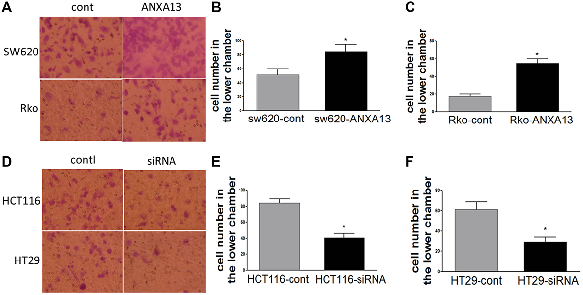 Figure 3: ANXA13 regulates CRC cell invasion in vitro invasion assays. (A) Images showing invasive cells that migrated to the bottom chambers. (B, C) Summary graph showing that ANXA13-overexpression significantly increased the number of invasive cells in SW620 (B) and Rko (C) cells. (D) Images showing invasive cells that migrated to the bottom chambers. (E, F) Summary graph showing that ANXA13 siRNA significantly decreased the number of invasive cells in HCT116 (E) and HT29 (F) cells. Values are mean ± SEM; n = 3; *P < 0.05, **P < 0.01 by unpaired Student’s t test.