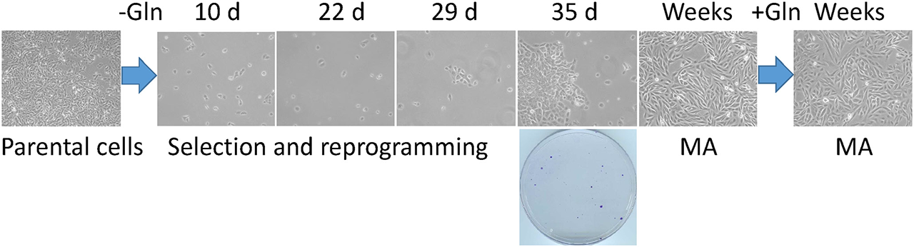 Figure 1: A cell culture model of the rare cancer cells that survive a severe metabolic challenge and “evolve” to emerge as highly adaptable. Triple-negative breast cancer SUM149-Luc cells were plated in 10-cm dishes (5 × 10 5 per dish) in culture medium containing dialyzed FBS and no glutamine (Gln). While >99.9% of the cells died quickly, a small number of cells survived in quiescence for 3–4 weeks; there were innumerable abortive attempts at cell growth during this period. We postulate that a few cells in this initial period of 3–4 weeks “evolved” to a point that they eventually succeeded in forming colonies. Shown are representative cell cultures (10 × magnification) at various stages, along with a stained dish at 5 weeks (representative image taken from data in reference 13). Metabolically adaptable (MA) cancer cells selected in this manner can be cultured indefinitely in a medium without or with glutamine; representative MA cultures depicting mesenchymal morphology in both media are shown.