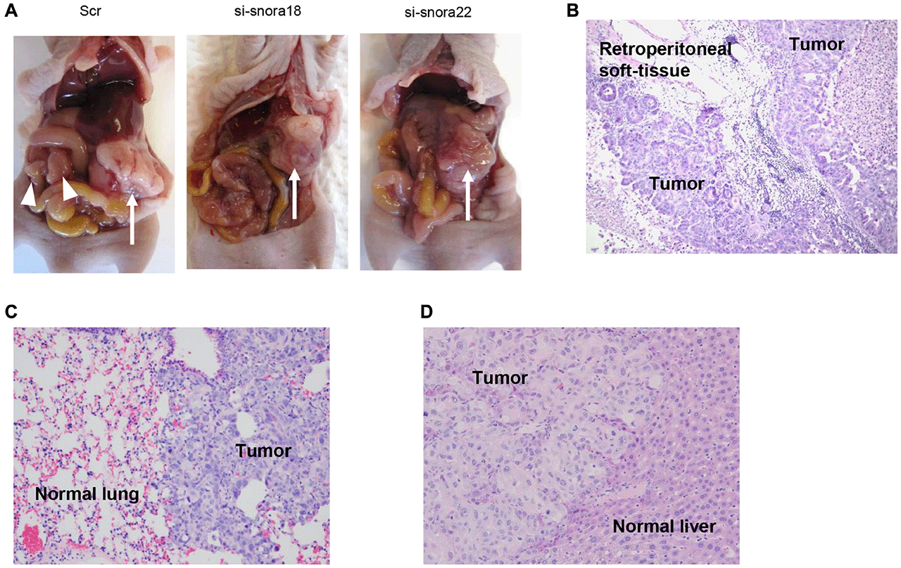 Figure 9: Knockdown effect of siRNA-FA-PEG-COL nanoparticles targeting KHSRP-bound snoRNAs on cell motility and invasion in the orthotopic murine model of PDAC. (A) Development of carcinomatosis in S2-013 tumor-bearing mice treated with scrambled control siRNA-FA-PEG-COL nanoparticles (Scr) and target siRNA-FA-PEG-COL nanoparticles against SNORA18 (si-snora18) and SNORA22 (si-snora22). Arrow, primary tumor; arrowheads, dissemination nodules in the abdominal cavity. (B–D) Hematoxylin and eosin staining of representative sections of S2-013-derived PDAC tumor tissues in mice treated with scrambled control siRNA-FA-PEG-COL nanoparticles showing areas of regional invasion of the retroperitoneum (B) and distant metastases to the lung (C) and liver (D). Original magnification: 200×.