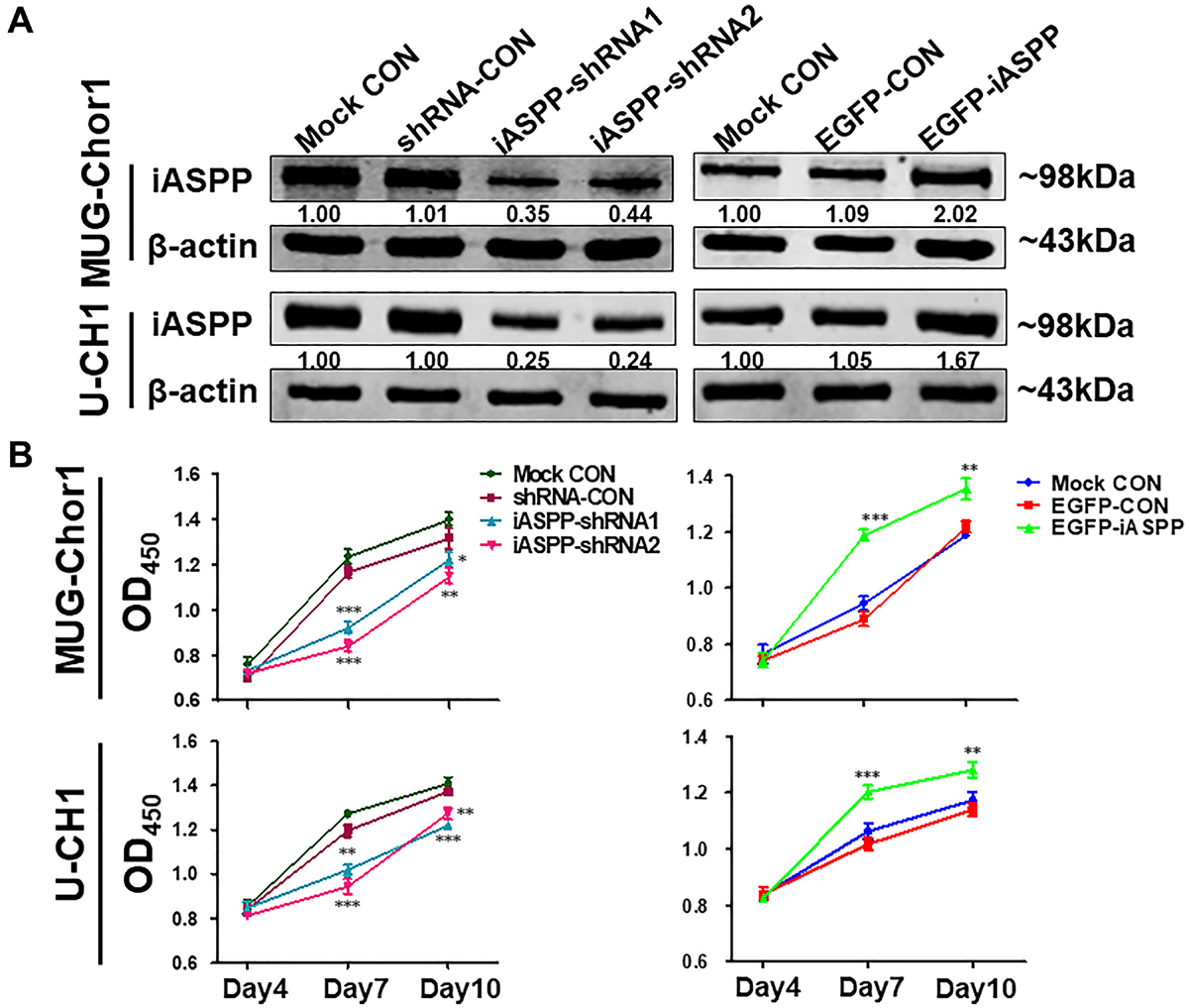 Figure 3: The extrinsic knockdown and overexpression of iASPP and their effects on cells proliferation based on CCK-8 assays. (A) The extrinsic knockdown and overexpression of iASPP in MUG-Chor1 and U-CH1 cells as identified by WB. Numbers below pictures represent semi-quantitative analysis of each line by Quantity One software. (B) Proliferation of both cells with iASPP knockdown and overexpression. n = 3. Mean ± SEM. *p < 0.05, **p < 0.01, ***p < 0.001, iASPP-shRNA1 group or iASPPshRNA2 group vs. shRNA-CON group, and EGFP-iASPP group vs. EGFP-CON group. CON: control.