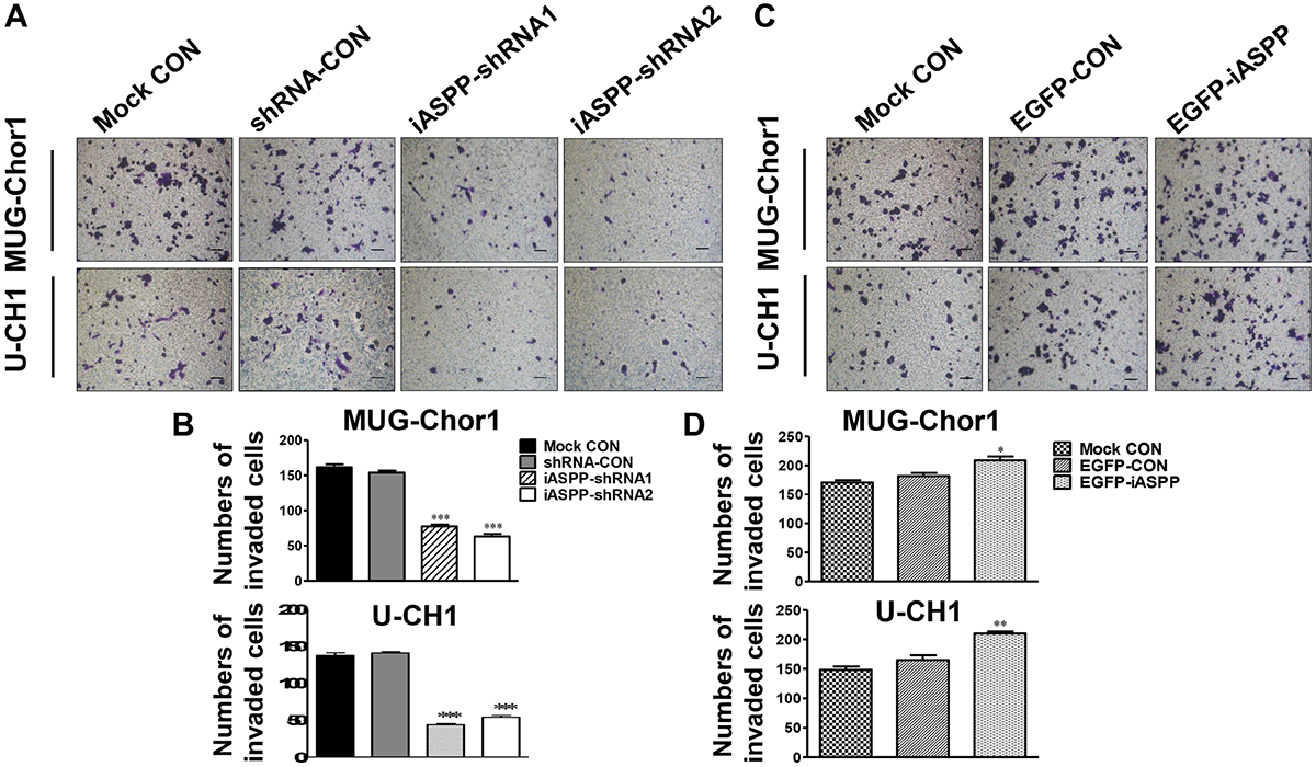 Figure 5: Effect of iASPP knockdown and overexpression on cells invasion. (A) Pictures of transwell invasion assays in MUG-Chor1 and U-CH1 cells after the iASPP knockdown with iASPP-shRNAs. (B) The number of both cells that invaded the substratum of the membrane per view under a 100× magnification after the iASPP knockdown with iASPP-shRNAs. (C) Pictures of transwell invasion assays in MUG-Chor1 and U-CH1 cells after the iASPP overexpression with EGFP-iASPP. (D) The number of both cells that invaded the substratum of the membrane per view under a 100× magnification after the iASPP overexpression with EGFPiASPP. n = 3. Mean ± SEM. *p < 0.05, **p < 0.01, ***p < 0.001, iASPP-shRNA1 group or iASPP-shRNA2 group vs. shRNA-CON group, and EGFP-iASPP group vs. EGFP-CON group. CON: control. Bar scale = 100 μm.