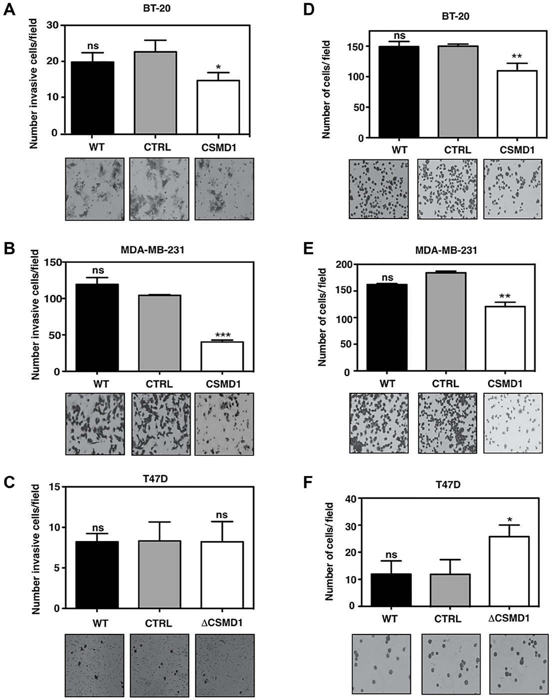 Figure 4: Forced expression of CSMD1 decreases cell invasion and adhesive capacity. (A–C) Cells capable of invading and migrating through a layer of matrigel to the underside of the cell culture insert membranes were photographed and counted after crystal violet staining for BT-20 (A), MDA-MB-231 (B) and T47D cells (C). Data are shown as the mean of cells counts ± SD from 3 independent experiments performed in single inserts. (D–F) Adherent cells to matrigel were photographed and counted after crystal violet staining for BT-20 (D), MDA-MB-231 (E) and T47D cells (F). Results shown are mean of cells counts ± SD from 3 independent experiments performed in at least four replicate. A one-way ANOVA was used to calculate statistical significance between the CTRL cells and CSMD1 expressing cells; *p < 0.05; **p < 0.01; ***p < 0.001; ****p < 0.0001.