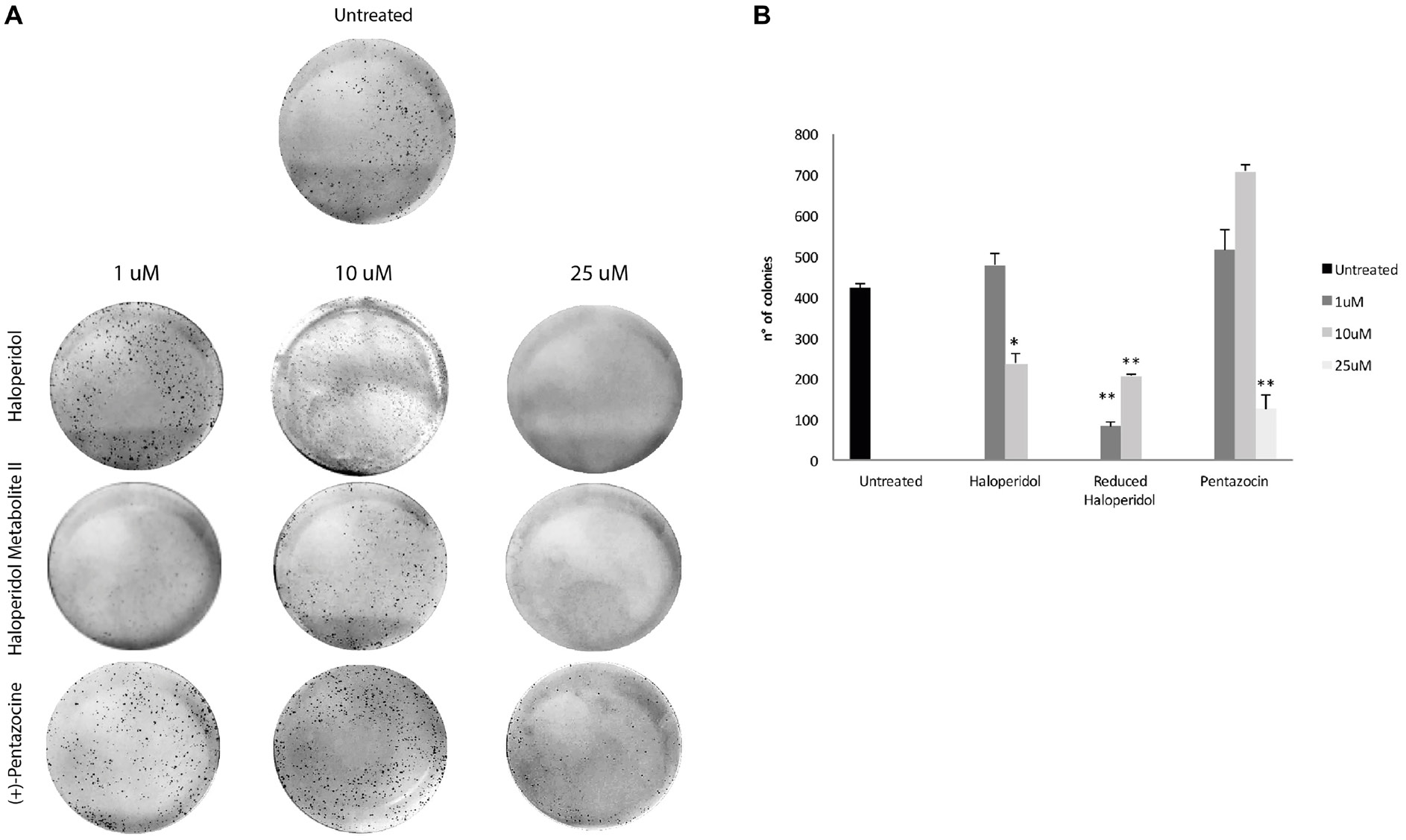 Figure 4: Colony formation capacity following treatments with (+)-Pentazocine, Haloperidol and Haloperidol metabolite II. (A) Images are representative of four separate experiments and (B) number of colonies were manually counted and presented as the mean ± SD of four independent experiments. (*p < 0.01 vs. control).