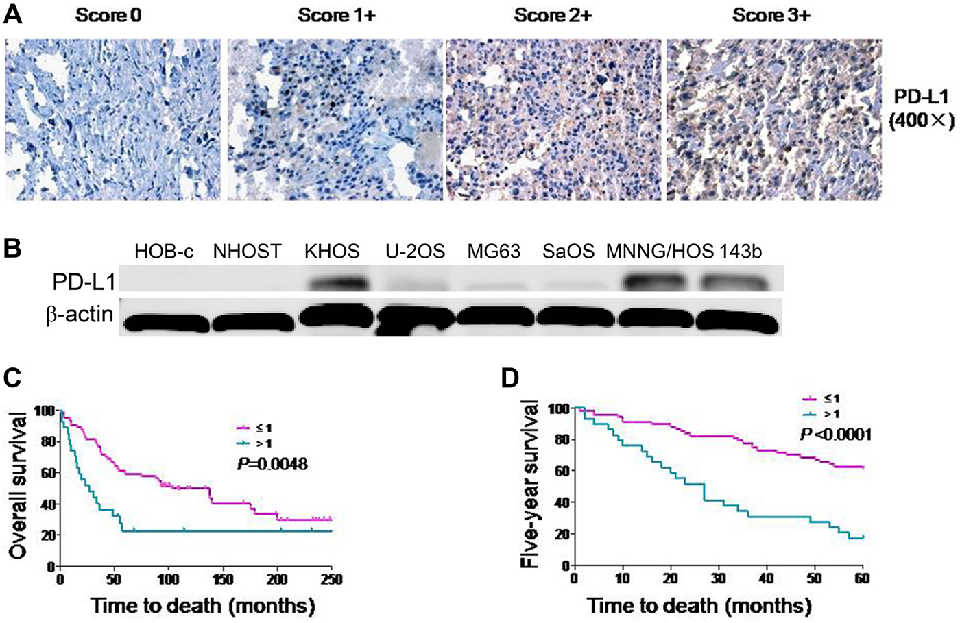 Figure 1: Expression of PD-L1 protein in osteosarcoma cell lines and osteosarcoma patient tissues. (A) Representative images of different immunohistochemical staining intensities of PD-L1 are shown in osteosarcoma tissues. The percentage of cells showing positive cytoplasmic staining for PD-L1 was calculated by reviewing the entire spot. Based on the PD-L1 staining intensities in the tumor samples, the staining patterns were categorized into 4 groups: no staining (0), weak staining (1+), moderate staining (2+) and intense staining (3+) (Original magnification, 400×). (B) Expression of PD-L1 protein in osteosarcoma cell lines and normal osteoblast cell lines. (C) Kaplan-Meier overall survival curve of patients with osteosarcoma were subgrouped as either PD-L1 low staining (staining ≤ 1) or high staining (staining ≥ 2). (D) Kaplan-Meier five-year survival curve of patients with osteosarcoma were subgrouped as either PD-L1 low staining (staining ≤ 1) or high staining (staining ≥ 2).