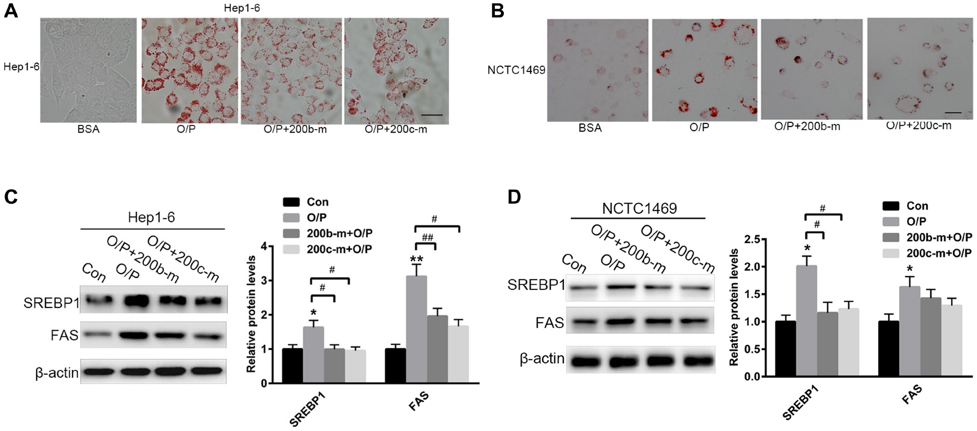 Figure 3: The over-expression of miR-200b and miR-200c reverses oleic acid/palmitic acid-induced lipid accumulation in hepatocytes. (A, B) Oil red O staining of Hep1-6 and NCTC1469 cells pre-treated with a mixture of oleic acid/palmitic acid (2:1, M/M) for 24 h. (C, D) Western blots showing the expression of SREBP1 and FAS in Hep1-6 and NCTC1469 cells pre-treated with a mixture of oleic acid/palmitic acid (2:1, M/M) for 24 h and then transfected with miR-200b and miR-200c mimics. The data represent the mean ± SEM of three independent experiments. *P < 0.05 and **P < 0.01 versus the control; #P < 0.05 and ##P < 0.01 versus O/P. The bar represents 10 μm.