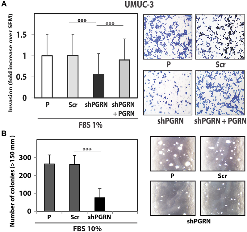 Figure 3: Progranulin targeting modulates invasion and anchorage-independent growth of UMUC-3 urothelial cancer cells. (A) Parental (P), shScr-transfected (Scr) control and Progranulin-depleted (shPGRN) UMUC-3 cells were assessed for invasive ability through Matrigel-coated transwells as described in Materials and Methods. Data are the average of three independent experiments ± SD. ***P < 0.001. Recombinant human progranulin was supplemented at 80 nM. (B) Anchorage-independent growth was measured by colony formation in soft-agar as previously described [18, 19, 49]. Colonies > 150 μM were counted. The experiment is the average of three independent experiments run in duplicates ± SD.***P < 0.001.