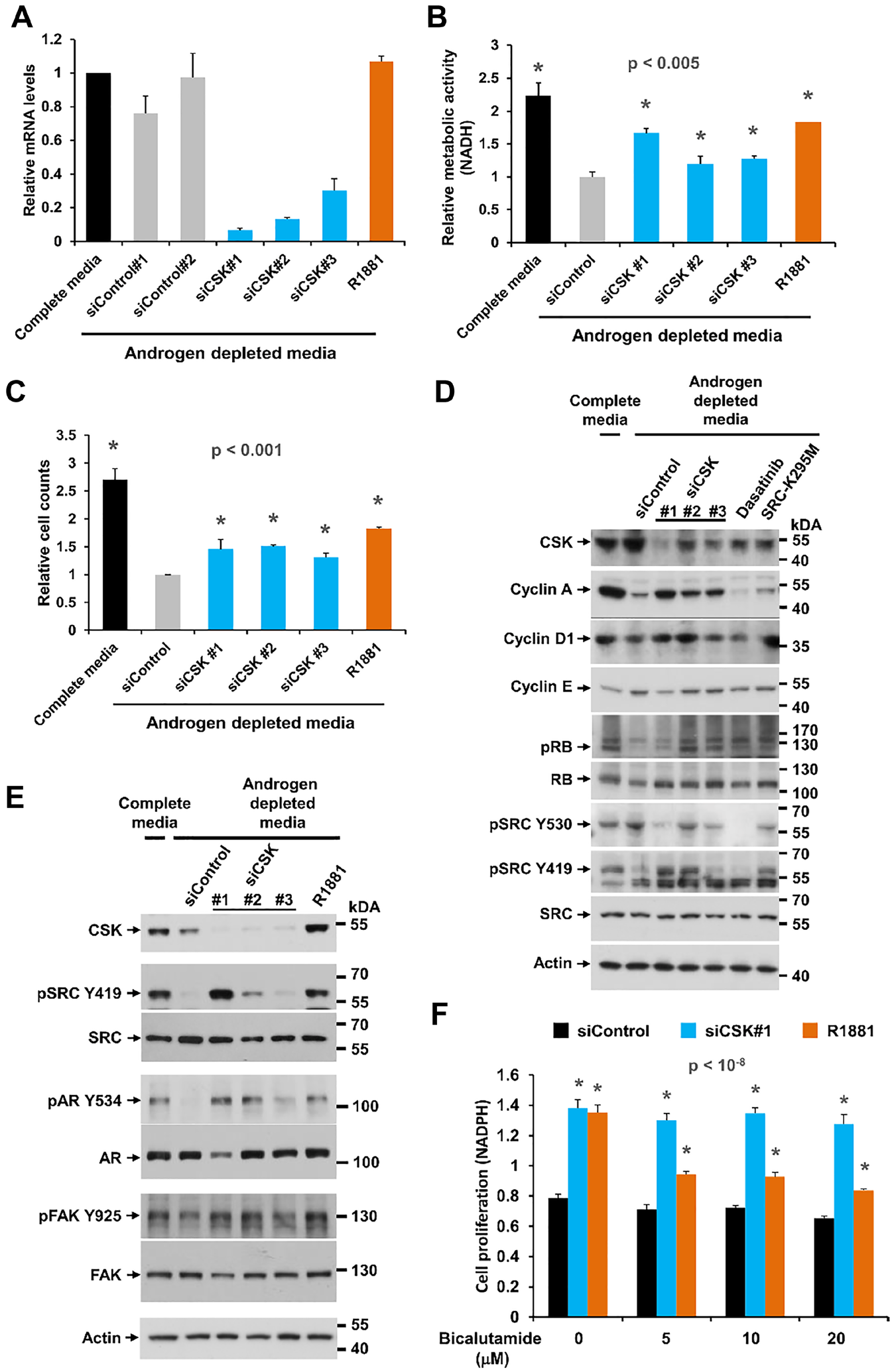 Figure 1: Effect of CSK knockdown on androgen-independent proliferation and SRC activity in LNCaP cells. (A) LNCaP cells were depleted of androgen for 72 h, followed by transfection of different siRNAs targeting CSK. After 48 h, cells were harvested for determination of knockdown efficiency by Q-PCR. (B, C) Cell proliferation was determined with the MTS assay and by cell counting. The synthetic androgen R1881 was used as positive control. Error bars represent standard deviations of 3 – 6 replicate measurements. Significance of the differences to the siControl sample (grey bar) was assessed by calculating p values using an unpaired t-test, two-tailed distribution, assuming equal variance. Asterisks denote significant differences. (D, E) Protein lysates obtained under the same conditions were probed with antibodies for cell cycle markers and markers of SRC activity. Dasatinib treatment and overexpression of the dominant negative SRC-K295M mutant was used to confirm the identity of the pSRC Y419 and Y530 bands, both of which were eliminated by the tyrosine kinase inhibitor. (F) The anti-androgen bicalutamide was added to cells at the time of siRNA transfection to determine the dependence of cell proliferation induced by CSN knockdown on AR signaling. Error bars represent standard deviations of 7 replicate measurements. Significance of the differences to the androgen depleted sample (black bar) was assessed by calculating p-values using an unpaired t-test, two-tailed distribution, assuming equal variance. Asterisks denote significant differences relative to the siControl values (black bars).